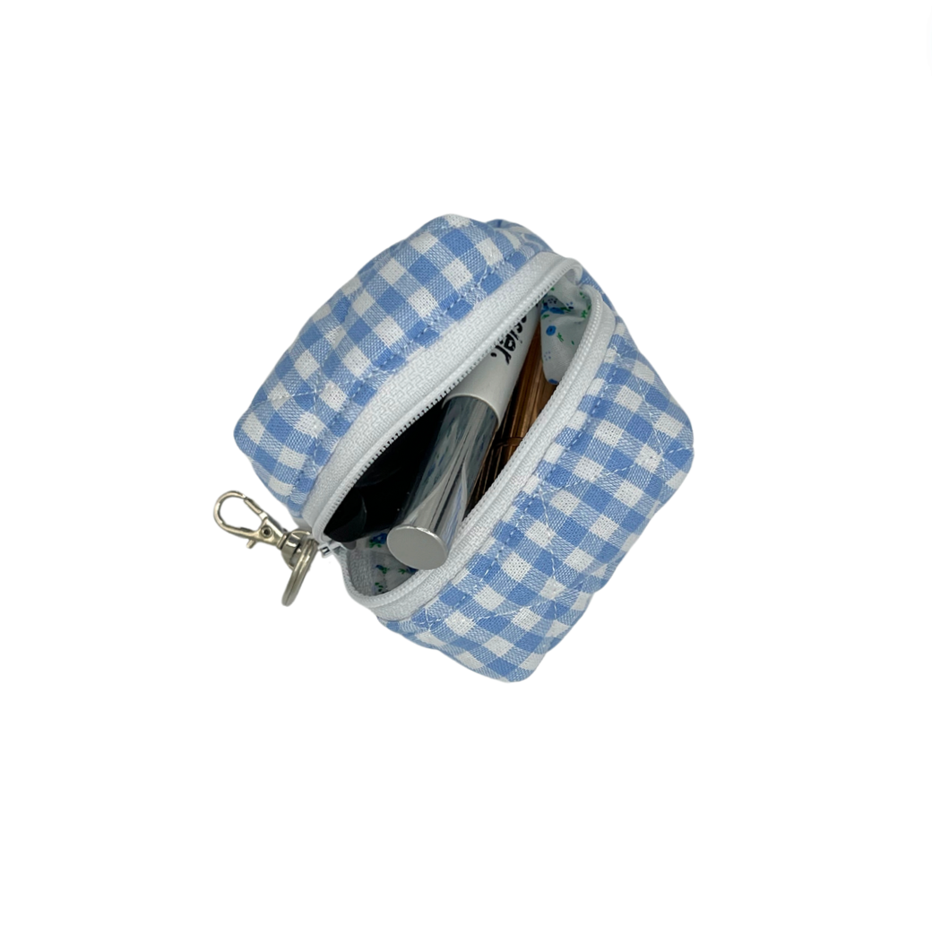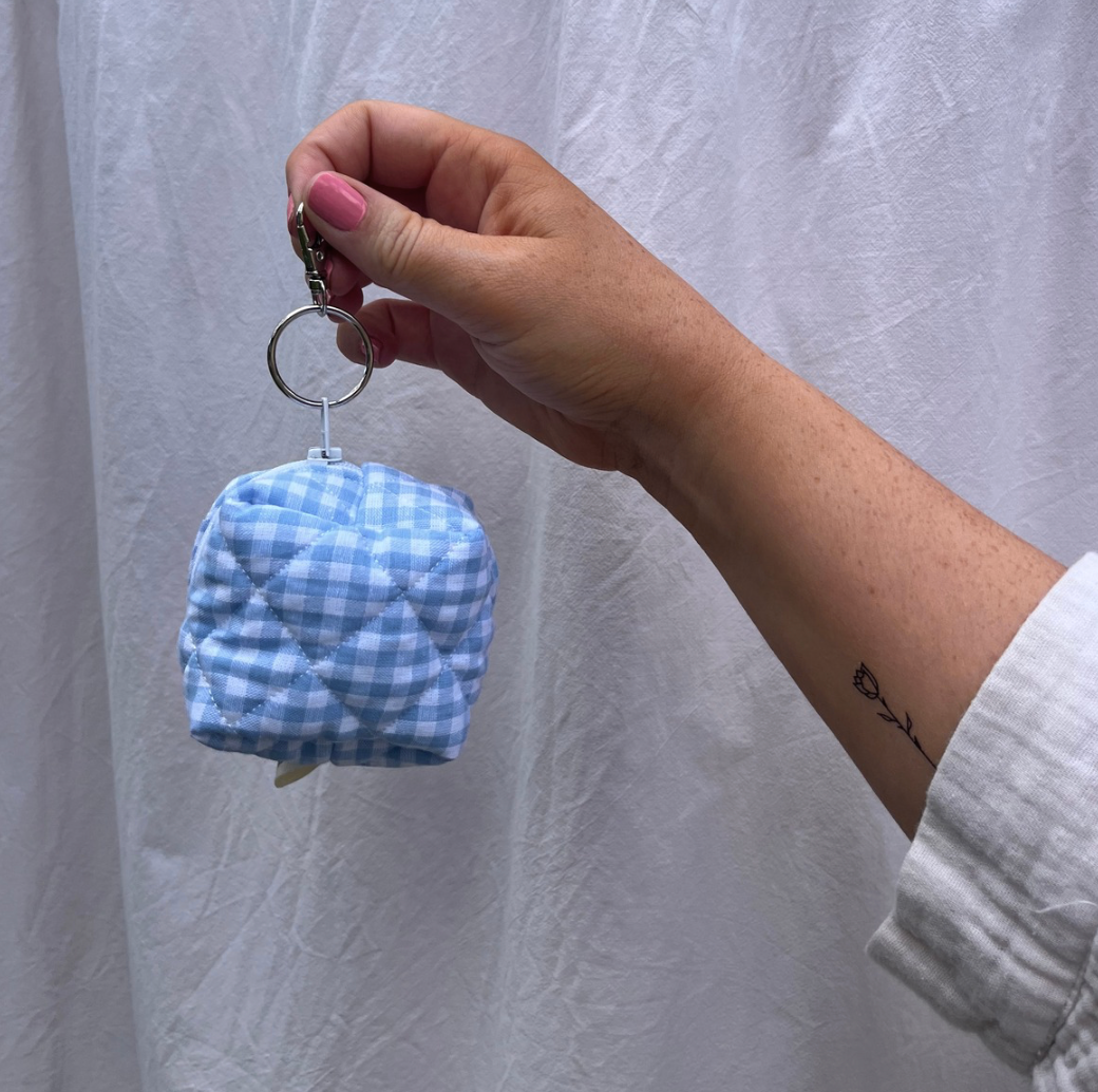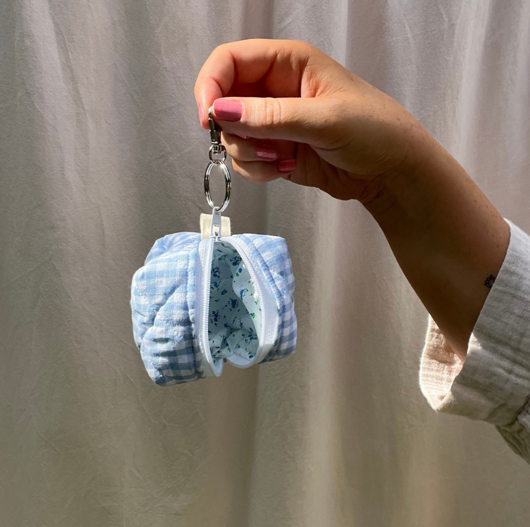 Beau Micro Keychain is a handmade Valiroma pouch made from cotton gingham fabric and a floral blue insert and white zip! The cutest keychain to attach to your keys, bag or use her as a micro storage for your handbag!