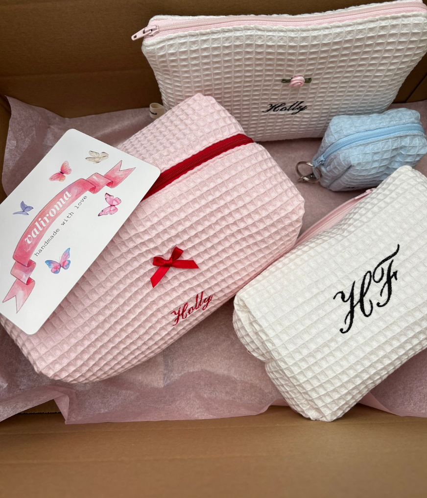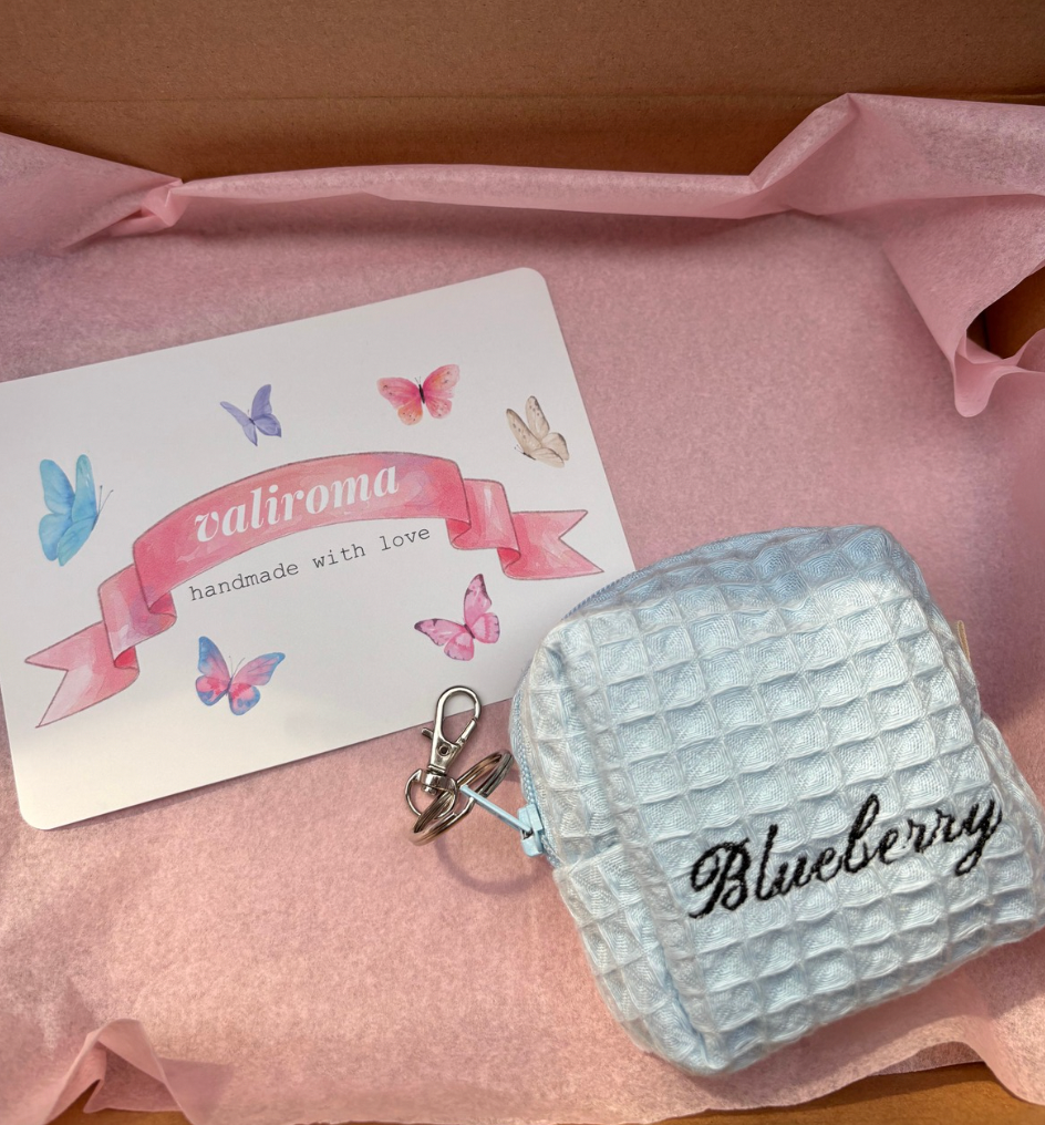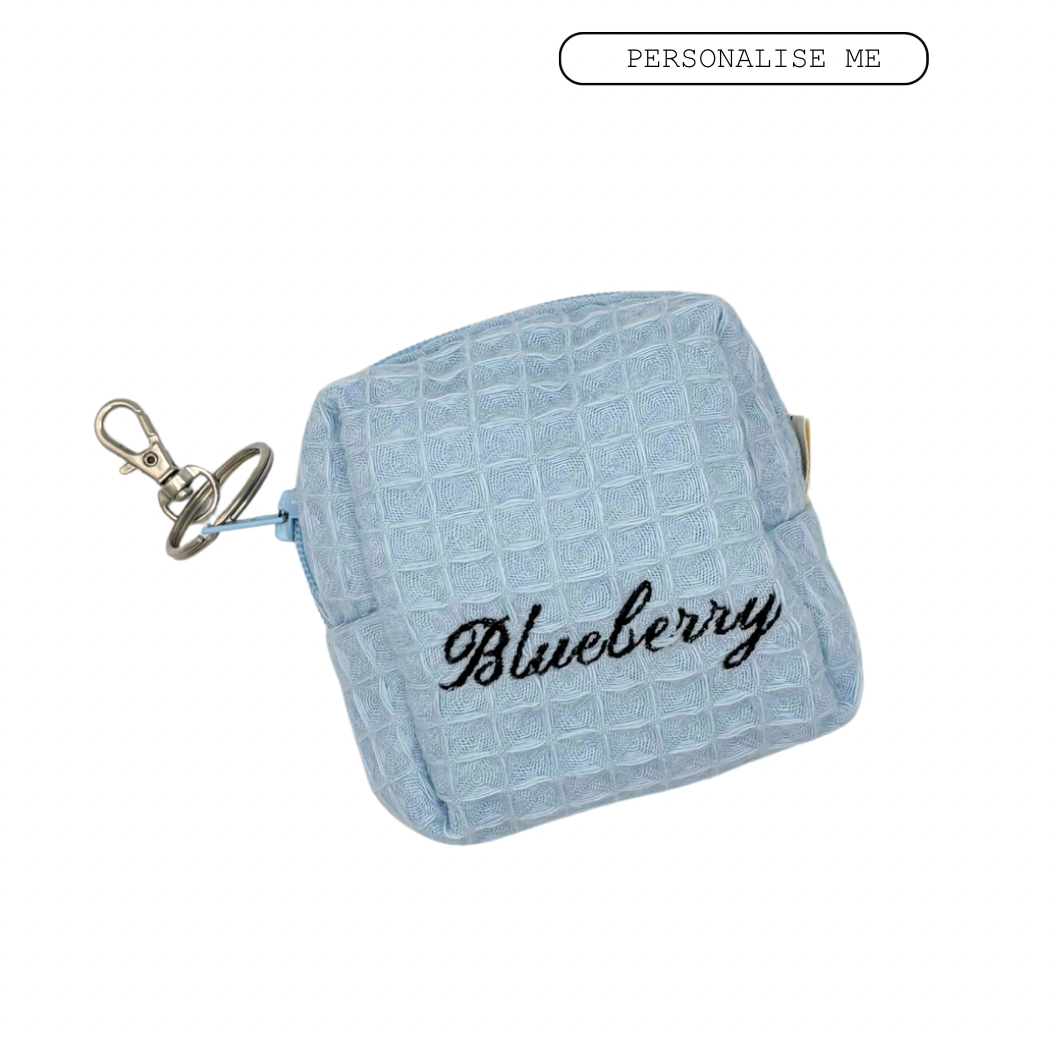 Handmade with love in our garden studio, the Blueberry Micro Pouch is crafted from soft cotton in a dreamy blueberry shade, complete with a matching zip and lining. Now available with personalisation — add your initials, name, or our signature flower/bow embroidery to make it truly yours 💫