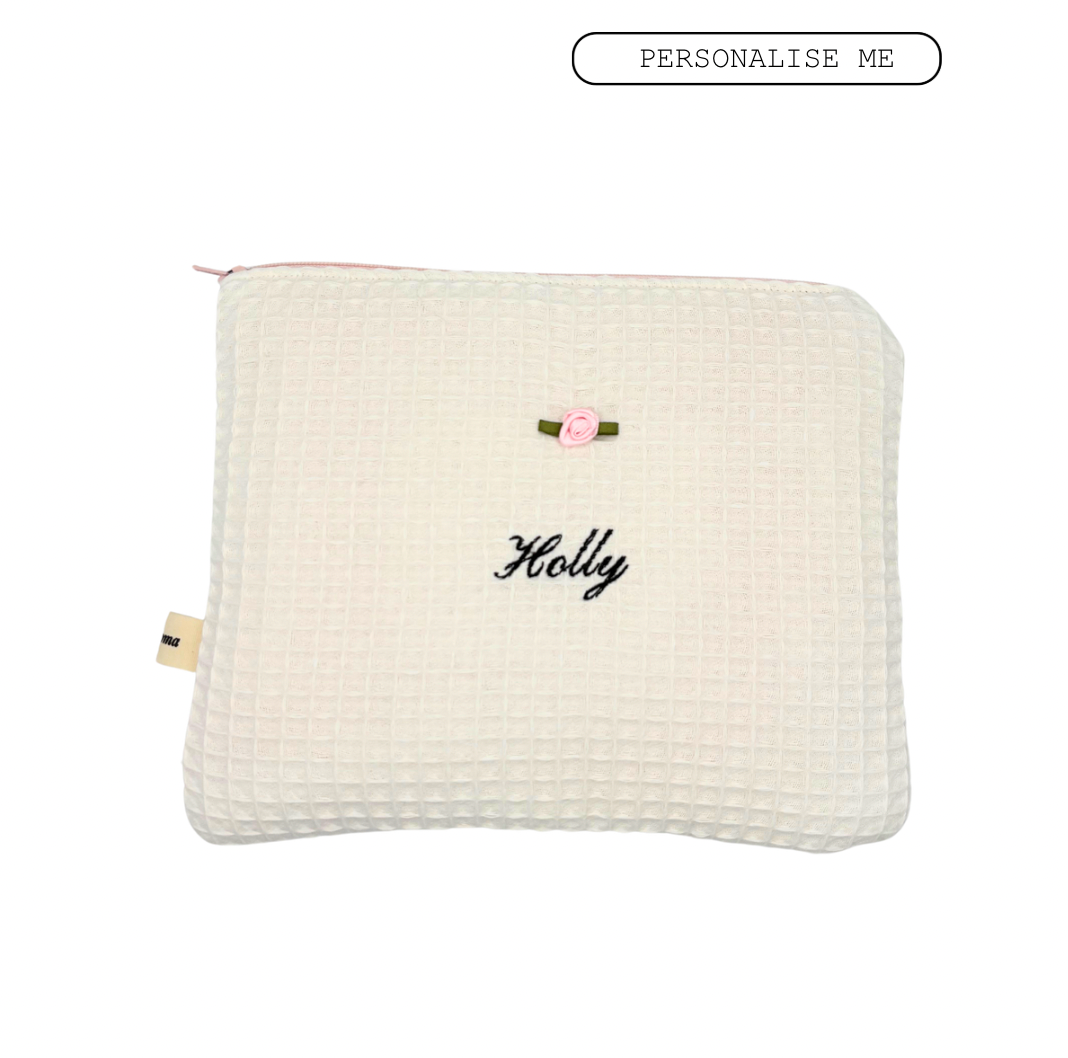 Each pouch is crafted in small batches using 100% organic cotton, fully lined, softly cushioned, and finished with a smooth zip — made to be treasured for years to come. Add your name, initials, or a special word to make it truly yours (or the perfect gift for someone special).