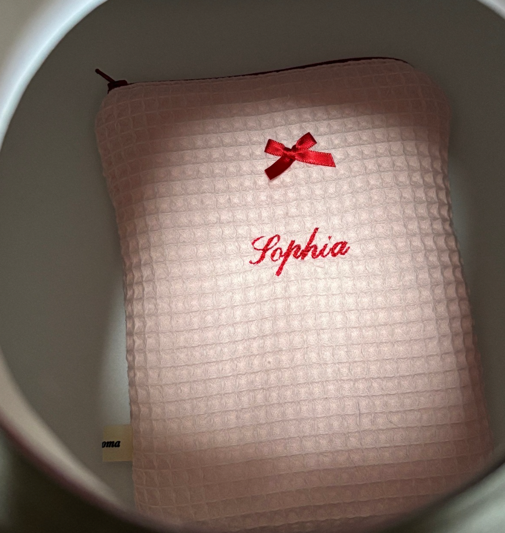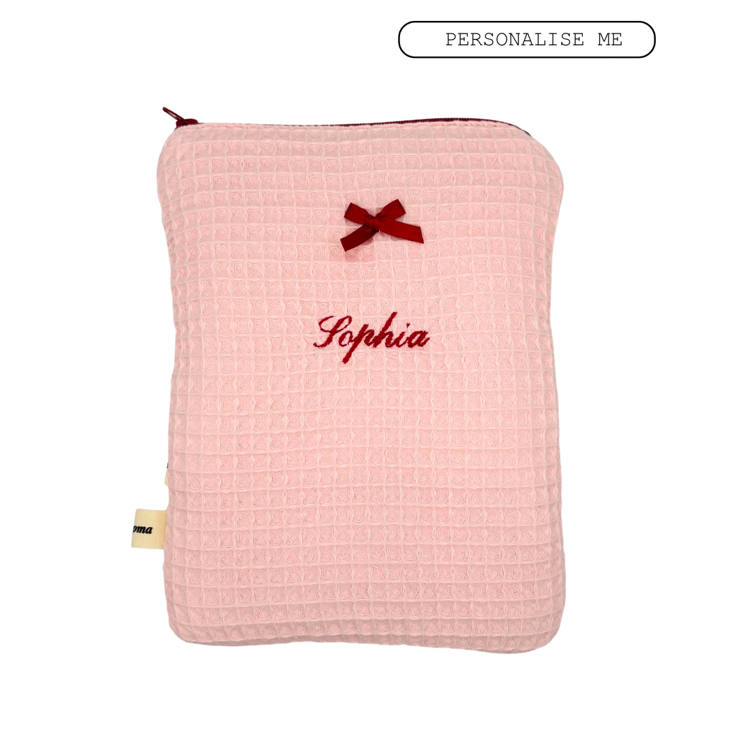 Crafted in a romantic red and blush combo using 100% organic cotton, Rosa is softly quilted, fully lined, and finished with a secure zip. Each piece is personalised and made to order, stitched in our studio using our new embroidery machine.